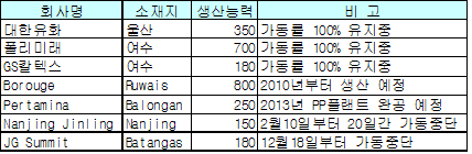 폴리미래ㆍ대한유화ㆍGS칼텍스 풀가동 … Jinling은 가동중단 아시아 PP(Polypropylene) 가동률이 대조되는 양상을 나타내고 있다.폴리미래는 여수 소재 70만톤 플랜트를 100% 가동하고 있으며 GS칼텍스도 여수 소재 18만톤 플랜트를 풀가동하고 있다. 대한유화 역시 울산 소재 35만톤 플랜트를 100% 가동하고 있다.
