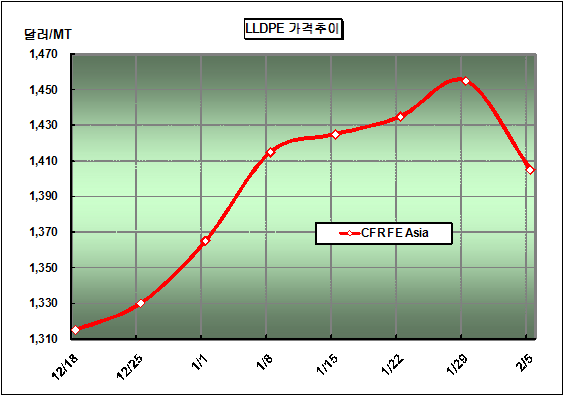 CFR FE Asia 1400-1410달러 형성 … Sinopec Maoming 공장 풀가동 LLDPE 가격은 2월3일 CFR FE Asia 톤당 1405달러로 50달러 하락했다.아시아 LLDPE(Linear Low-Density Polyethylene) 가격은 국제유가가 배럴당 70달러대로 하락하고, 중국과 타이완의 구매수요 감소로 하락세로 전환했다. 중국 내수가격은 ex-works 톤당 1만1100-1만1200위안으로 수입가격 기준 CFR 톤당 1304-1316달러에서 거래되고 있다.