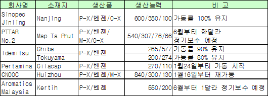 PTTAR No.2 풀가동 … PTTARㆍAromaticsM은 6월 정기보수 아시아 아로마틱(Aromatic)의 가동률이 양호한 상태를 유지하고 있다.Sinopec Jinling의 Nanjing 소재 P-X(Para-Xylene) 60만톤, 벤젠(Benzene) 35만톤, O-X(Ortho-Xylene) 10만톤 플랜트는 1월20일 재가동 이후 가동률 100%를 유지하고 있으며, PTTAR No.2의 Map Ta Phut 소재 P-X 54만톤, 벤젠 30만7000톤, M-X(Mixed-Xylene) 7만6000톤, O-X 6만6000톤 플랜트 역시 풀가동 중이다. Idemitsu의 Chiba 소재 P-X 26만5000톤, 벤젠 57만7000톤 플랜트와 Tokuyama 소재 P-X 20만톤, 벤젠 27만4000톤 플랜트는 각각 90%와 80% 가동률하고 있다. 신규가동 및 재가동도 이어지고 있다. Pertamina의 Cilacap 소재 P-X 27만톤, 벤젠 11만톤 플랜트는 1월24일 가동에 들어갔으며, CNOOC의 Huizhou 소재 P-X 84만톤, 벤젠 30만톤, M-X 13만톤 플랜트는 1월8일 가동은 중단했으나 1월16일 재가동을 시작했다.