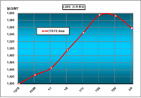 CFR FE Asia 1555-1560달러 … 재고 증가에 수요 감소 LDPE 가격은 2월3일 CFR FE Asia 톤당 1555-1600달러로 1600달러를 넘지 못하고 하락세로 전환됐다.아시아 LDPE(Low-Density Polyethylene) 가격은 PE(Polyethylene) 재고가 전반적으로 증가하는 가운데 수요 감소로 이중고에 시달리며 전주대비 35달러 하락했다. LDPE 메이저들은 코스트 압박으로 CFR FEA 톤당 1600달러에 오퍼하고 있으나 구정연휴 이후 가격이 추가 하락할 것에 대비해 재고 처리에 주력하고 있다.