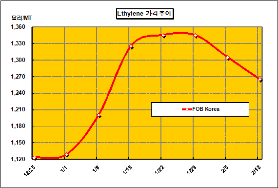 FOB Korea 1260-1270달러 형성 … 여천NCC 가동률 91-92% 에틸렌 가격은 2월12일 FOB Korea 톤당 1265달러로 40달러 하락했다.아시아 에틸렌(Ethylene) 가격은 사우디와 이란에서 공급과잉 압박이 심화됨에 따라 한국과 일본의 정기보수 홍수에도 불구하고 하락세가 지속됐다. 특히, 여천NCC가 No.1 87만5000톤 스팀 크래커의 가동률을 91%로 조정했고, 일본의 정기보수 일정에 따라 아시아 에틸렌 가격이 요동치고 있다.