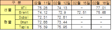 2월16일 WTI 2.88달러 올라 77.01달러 형성 … Brent는 75.68달러로 2월16일 국제유가는 미국의 달러화 약세, 경기지표 개선 소식 등의 영향으로 상승했다.한국석유공사에 따르면, 뉴욕상업거래소(NYMEX)에서 거래된 WTI(서부텍사스 경질유) 선물유가는 전일대비 배럴당 77.01달러로 2.88달러, Brent 선물유가는 75.68달러로 3.17달러 급등했다. 두바이유 현물가격은 음력 설 연휴로 입전되지 않았다.
