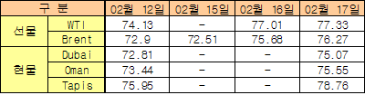 2월17일 2.26달러 올라 75.07달러 형성 … WTIㆍBrent도 소폭 상승 2월17일 국제유가는 세계경기 회복에 대한 기대감으로 상승했다.한국석유공사에 따르면, 뉴욕상업거래소(NYMEX)에서 거래된 WTI(서부텍사스 경질유) 선물유가는 전일대비 배럴당 77.33달러로 0.32달러, Brent 선물유가는 76.27달러로 0.59달러 상승했다. 두바이유 현물가격은 미국의 달러화 약세, 경기지표 개선 소식 등의 영향이 뒤늦게 반영돼 2.26달러 오른 75.07달러에 거래를 마감했다.
