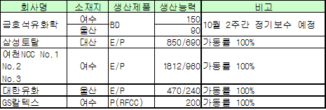 금호, BD 24만톤 정기보수 예정 … NCC 가동률 100% 유지 국내 올레핀(Olefins) 가동률이 호조를 보이고 있다.삼성토탈의 대산 소재 에틸렌(Ethylene) 85만톤 크래커는 가동률 100%를 보이고 있으며, 여천NCC 역시 여수 소재 에틸렌 181만2000톤 크래커를 100% 가동하고 있다. 대한유화는 울산 소재 에틸렌 47만톤 크래커를 100% 가동하고 있으며, GS칼텍스는 여수 소재 프로필렌(Propylene) 20만톤의 RFCC 플랜트를 100% 가동중이다.