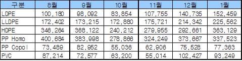 HDPE 24.0%로 최대 폭 증가 … PP Homo는 9.7% 감소 33만7523톤 중국의 1월 폴리머 수입이 회복세로 전환했다.LDPE(Low-Density Polyethylene)는 2009년 8월 10만180톤으로 22.8%, 9월 9만8092톤으로 2.1%, 10월 8만3854톤으로 14.5% 감소했으나 11월에는 10만7755톤으로 28.5% 증가했고 12월에는 14만735톤으로 30.6% 증가했고, 2010년 1월에도 15만2459톤으로 8.3% 증가했다. LLDPE(Linear LDPE)는 2009년 8월 17만2402톤으로 6.7%, 9월 17만3215톤으로 0.5% 증가했으나 10월에는 17만2880톤으로 소폭 감소했다. 그러나 11월에는 17만5721톤으로 다시 1.6% 증가했고 12월에도 21만4342톤으로 22.0% 증가하며 상승세를 이어나갔고, 2010년 1월에도 5.2% 증가해 22만5562톤을 기록했다. HDPE(High-Density PE)는 2009년 8월 34만6264톤으로 14.5% 감소했으나 9월에는 36만8122톤으로 6.3% 증가했고 10월 24만212톤으로 큰 폭으로 감소했으나 11월 27만9955톤으로 16.5% 증가하며 회복세로 전환했으며 12월에는 29만2661톤을 기록하며 4.5% 증가했고, 2010년 1월 36만3129톤을 기록하며 24.0%로 6대 폴리머 중 최대 폭으로 증가했다. PP Copolymer도 2009년 8월 7만3489톤으로 감소했으나 9월에는 다시 12.9% 증가했으나 10월 다시 5만톤대로 추락했고, 11월에는 6만2906톤을 기록하며 14.3% 증가해 혼조세를 이어나갔으며 12월에는 15.2% 증가해 37만3667톤을 기록했고, 2010년 1월에는 2.4% 증가해 7만7363톤을 기록했다.