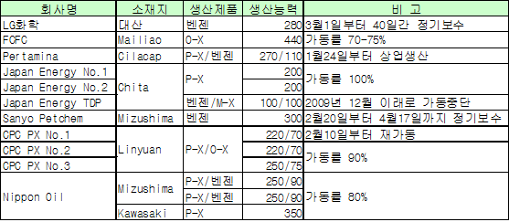 LG화학, 3월1일부터 돌입 … Japan Energy는 가동률 100% 아시아 BTX 생산기업들의 정기보수 및 가동중단이 봇물을 이루고 있다.LG화학은 대산 소재 벤젠 28만톤을 3월1일부터 40일간 정기보수할 예정이다. Sanyo Petchem은 Mizushima 소재 벤젠(Benzene) 30만톤 플랜트는 2월20일부터 4월17일까지 정기보수할 것이라고 밝혔다. Japan Energy TDP는 Chita 소재 벤젠 10만톤, M-X(Mixed-Xylene) 10만톤을 2009년 12월 이후로 가동중단하고 있다.