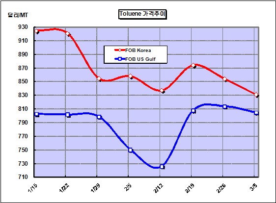 FOB Korea 830-831달러 형성 … 수요 감소에 재고 급증이 원인 톨루엔(Toluene) 가격 하락세가 멈추지 않고 있다.톨루엔 가격은 3월5일 전주대비 23달러 하락하며 FOB Korea 톤당 830-831달러를 형성했다. 중국수요 둔화와 재고량 급증이 맞물리고 있기 때문으로 판단된다. 중국에서는 3월 인도물량 톨루엔이 톤당 855-860달러, 4월 인도물량은 870달러를 형성하기도 했으나 실질적인 거래는 이루어지지 않고 있는 것으로 알려지고 있다.