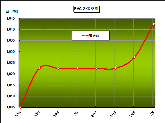 CFR China 1040-1045달러 형성 … 인디아 수요 급증에 주목 PVC 가격이 완만한 상승세를 보였다.아시아 PVC(Polyvinyl Chloride) 가격은 전주대비 15달러 상승해 3월3일 CFR China 톤당 1040-1045달러를 형성했다. 아시아 PVC 생산기업들은 3월 도착물량의 선물거래를 2월보다 20달러 상승한 톤당 1040달러에 거래한 것으로 알려졌다.