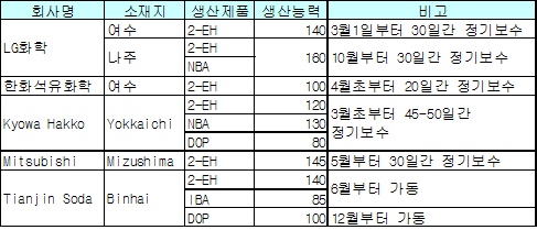 LG화학, 2-EH 3월부터 1달간 정기보수 … Tianjin Soda 6월부터 가동 아시아 가소제 시장의 정기보수가 3, 4월부터 줄줄이 이어질 전망이다.LG화학은 여수 소재 2-EH(Ethylhexanol) 14만톤을 3월1일부터 한달간, 나주 소재 2-EH 및 NBA(Normal Butyl Alcohol) 16만톤을 1월부터 한달간 정기보수할 예정이다. 한화석유화학도 여수 소재 2-EH 10만톤을 4월초부터 20일간 정기보수할 계획이라고 밝혔다. Kyowa Hakko는 Yokkaichi 소재 2-EH 12만톤, NBA 13만톤, DOP(Dioctyl Phthalate) 8만톤 플랜트를 3월 초부터 45-50일간 정기보수할 예정이며, Mitsubishi는 Mizushima 소재 2-EH 14만5000톤을 5월부터 30일간 정기보수할 계획이다.