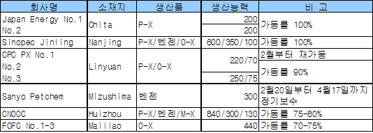 Japan Energy·CPC PX 정상가동 … Sanyo는 2월부터 정기보수 아시아 BTX 가동률이 정상화 양상을 보이고 있다.Japan Energy의 Chita 소재 P-X(Para-Xylene) No.1, No.2 각각 20만톤 플랜트는 가동률 100%를 유지하고 있다. Sinopec Jinling의 Nanjing 소재 P-X 60만톤, 벤젠(Benzene) 35만톤, O-X(Ortho-Xylene) 플랜트 역시 가동률 100%를 나타내고 있다. CPC PX의 Linyuan 소재 No.1 P-X 22만톤, O-X 7만톤 플랜트는 2월10일부터 재가동에 돌입했으며, No.2 P-X 22만톤, O-X 7만톤, No.3 P-X 25만톤, O-X 7만5000톤 플랜트는 가동률 90%를 유지하고 있다.