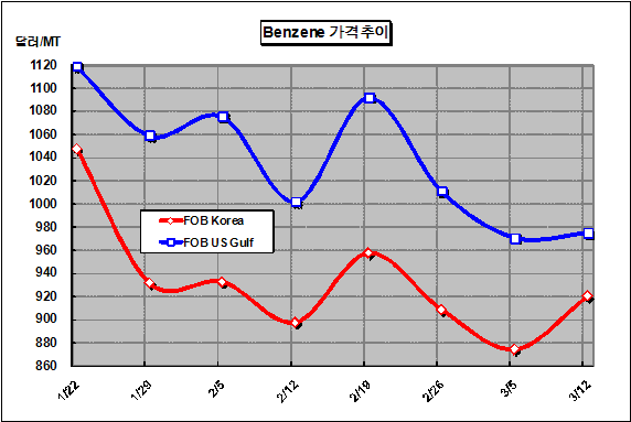 FOB Korea 919-920달러 형성 … 국제유가와 SM 수익 호조 영향 벤젠 가격은 3월12일 FOB Korea 톤당 920달러로 46달러 상승했다.아시아 벤젠(Benzene) 가격은 국제유가가 배럴당 80달러를 돌파하고 미국의 소비심리 회복, SM(Styrene Monomer) 수익 호조 등의 영향으로 2주만에 상승세로 전환했다. 그러나 아시아 유통기업들이 투기목적으로 높은 가격에 Spot 물량을 구매해 비축해 적절한 시기에 판매할 예정이어서 벤젠 가격 상승세가 이어질지 의문이 제기되고 있다.