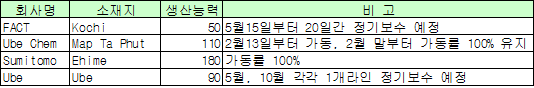 Ube Chem 가동률 100% 유지 … FACT는 5월15일부터 정기보수 아시아 CPL(Caprolatam) 시장은 가격 강세가 지속됨에 따라 정기보수가 잠잠하다.Sumitomo는 Ehime 소재 18만톤 플랜트를 2009년 12월 초 재가동해 가동률 100%를 유지하고 있으며, Ube Chem은 Map Ta Phut 소재 11만톤 플랜트를 2월13일부터 가동해 2월 말부터 풀가동하고 있다.