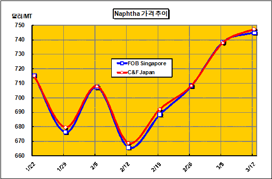 C&F Japan 744-750달러 형성 … 유럽은 730-740달러 유지 나프타 가격은 3월 둘째 주에 C&F Japan 톤당 747달러로 9달러 상승했다.아시아 나프타(Naphtha) 가격은 재고가 증가하고 있으나 국제유가가 강세를 보이면서 소폭 상승해 750달러에 도달했다. 1월초 760달러를 돌파했던 나프타 가격은 에틸렌(Ethylene) 크래커의 잇단 정기보수 영향으로 공급과잉으로 전환되며 상승과 하락을 반복했으나 국제유가 강세로 흐름이 뒤바뀌고 있다.