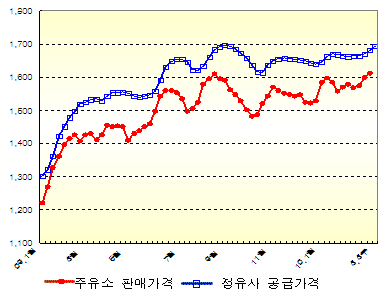 글로벌 금융위기를 겪었던 2008년 10월17일 리터당 1700.87원을 기록한 이후 17개월 여만에 다시 1700원대로 올라선 것이다. 국제유가는 미국의 원유 재고 증가 및 달러화 강세 등의 영향으로 약보합세를 보이며 5주 만에 상승세가 주춤했지만 그동안의 상승폭을 고려했을 때 석유제품 내수가격은 당분간 강세를 지속할 것으로 예상되고 있다. <고우리 기자> 표, 그래프: | 주유소의 휘발유 판매가격 추이 | <화학저널 2010/3/22> |