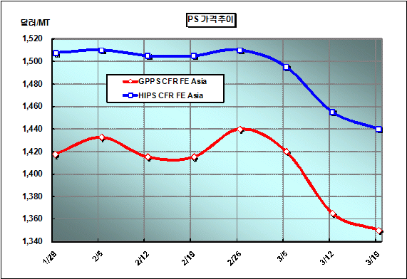 CFR FE Asia 1364-1366달러 형성 … Denka GPPS 20만톤 정기보수 PS 가격은 3월17일 CFR FE Asia 톤당 1365달러로 15달러 하락했다.아시아 GPPS(General Purpose Polystyrene) 가격은 원료 SM(Styrene Monomer) 가격이 1262달러로 상승했으나 일본의 Denka 정기보수와 수요하락 등의 영향으로 3주 연속 하락했다. 특히, Denka가 싱가폴 소재 GPPS 20만톤 플랜트를 3주 동안 정기보수함에 따라 GPPS 1만2000톤이 부족할 것으로 예상되고 있으나 재고를 충분히 확보한 것으로 알려지고 있어 시장에 미치는 여파는 크지 않을 것으로 전망된다.