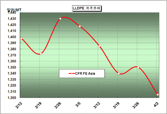 CFR FE Asia 1304-1306달러 형성 … 중국 수요 급감으로 LLDPE 가격은 CFR FE Asia 톤당 1305달러로 45달러 급락했다.아시아 LLDPE(Linear Low-Density Polyethylene) 가격은 중국 동부 및 서부 지방의 수요가 급감한 가운데 거래상들의 가격경쟁이 과열됨에 따라 다시 폭락했다.