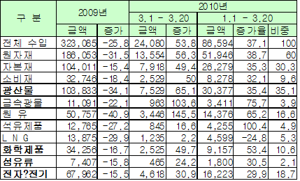 지경부, 3월 수입액 49.7% 늘어 … 석유제품은 16.6% 2010년 3월 화학제품 수입액이 50% 가까이 증가하고 석유제품은 16% 가량 늘어난 것으로 나타났다.지식경제부가 발표한 <2010년 3월 수출입동향>에 따르면, 3월 전체 수입은 전년대비 48.4% 증가한 354억9000만달러를 나타냈다. 소비 증가 및 설비도입 증가로 원자재를 비롯한 자본재와 소비재 수입이 모두 증가했기 때문이다.