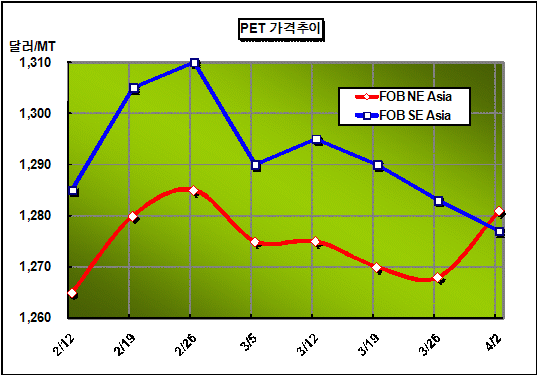 동남아지아는 FOB SE Asia 톤당 1276달러로 하락했다. 말레이의 PET 생산기업들은 1280달러를 제시했고, 구매기업들은 1260달러에 거래를 요구함에 따라 1276달러에 거래했다. <복혜미 기자> 표, 그래프: | PET가격추이 | <화학저널 2010/4/8> |