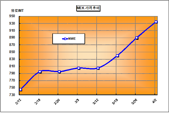 FOB Rotterdam 1220-1230달러 형성 … 프로필렌 상승 영향으로 MEK 가격이 상승세를 지속하며 1200달러를 돌파했다.유럽의 MEK(Methyl Ethyl Ketone) 가격은 FOB Rotterdam 톤당 1220-1230달러를 형성했다. 원재료인 프로필렌(Propylene) 가격 상승에 영향을 받은 것으로 해석된다. 이에 따라 MEK 생산기업들은 상승세가 4월 내내 지속될 것으로 보고 원재료 상승분을 판매단가에 반영할지를 두고 고민하고 있는 것으로 알려졌다.