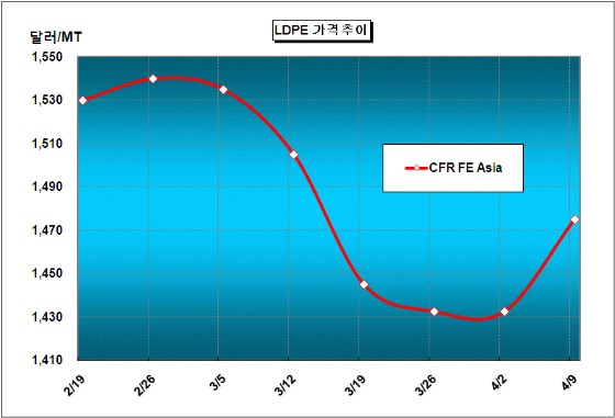 CFR FE Asia 1449-1451달러 형성 … 중국ㆍ인디아 농번기 진입 LDPE 가격은 4월9일 CFR FE Asia 톤당 1450달러로 47달러 상승했다.아시아 LDPE(Low-Density Polyethylene) 가격은 동남아 Petlin과 The Polyolefin이 4월 생산량 전부를 판매 중단함에 따라 아시아 지역의 일시적인 수급타이트가 발생해 반등했다. 중국 및 인디아가 농번기에 진입한 것도 호재로 작용했다.
