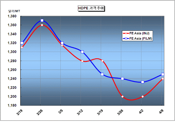 CFR FE Asia 1239-1241달러 형성 … 미국·남미 공급처 폐쇄 잇따라 HDPE 가격은 4월7일 CFR FE Asia 톤당 1240달러로 40달러 상승했다.아시아 HDPE(High-Density Polyethylene) 가격은 유가가 강세를 유지하고 시장심리가 회복됨에 따라 상승세로 전환됐다. 미국 및 남미 등 필름 그레이드 대체 공급처들이 잇따라 플랜트를 폐쇄한 것도 호재로 작용했다.