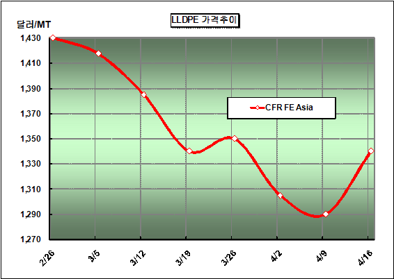CFR FE Asia 1339-1341달러 형성 … JG Summit 4월 중순 재가동 LLDPE 가격은 4월14일 전주대비 50달러 승상해 CFR FE Asia 톤당 1140달러를 기록했다.아시아 LLDPE(Linear Low-Density Polyethylene) 가격은 수급이 타이트한 가운데 수요가 호조를 보임에 따라 급등했다.