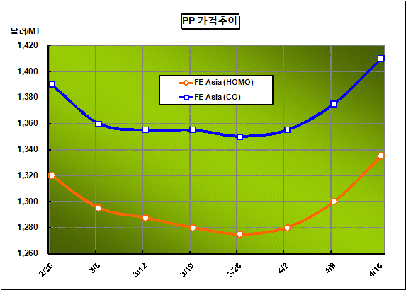 FOB Korea 1334-1336달러 형성 … 마진 마이너스 150달러 PP 가격은 4월16일 전주대비 FOB Korea 톤당 40달러 상승해 1315달러를 형성했다.아시아 PP(Polypropylene) 가격은 프로필렌 가격이 강세를 보이고 있는 가운데 수요처들이 재고 확보에 나서고 있고 중남미 수요까지 호조를 보여 2주째 상승세를 지속했다.