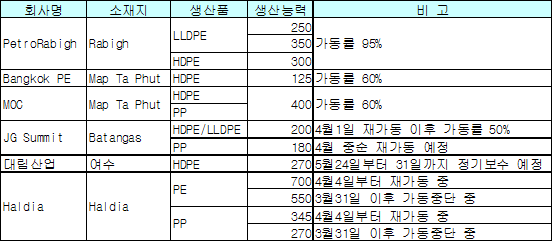 PetroRabigh 가동률 양호 … 대림산업은 HDPE 정기보수 예정 아시아 올레핀(Olefin) 플랜트의 가동률이 양극화되고 있다.PetroRabigh의 사우디 Rabigh 소재 LLDPE(Linear Low-Density Polyethylene) 25만톤 및 35만톤 플랜트와 HDPE(High Density PE) 30만톤 플랜트는 가동률 95%를 나타내고 있다. 그러나 Bangkok PE의 Map Ta Phut 소재 HDPE 12만5000톤 플랜트와 MOC의 Map Ta Phut 소재 HDPE와 PP(Polypropylene) 각각 40만톤 플랜트는 60% 가동에 그치고 있다. JG Summit의 Batangas 소재 HDPE와 LLDPE 각각 20만톤 플랜트는 4월1일 재가동 이후에도 가동률 50%에 그치고 있다. 반면, Haldia의 Haldia 소재 PE 70만톤, PP 34만5000톤 플랜트는 4월4일부터 재가동에 들어갔으며, JG Summit의 Batangas 소재 PP 18만톤 플랜트는 4월 중순부터 재가동할 것으로 알려지고 있다.