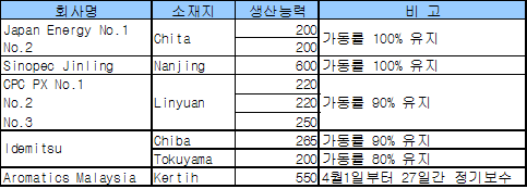 Japan Energy 풀가동 … Aromatics Malaysia는 정기보수 아시아 P-X(Para-Xylene)의 가동률이 높게 유지되고 있다.Japan Energy의 Chita 소재 No1과 No.2 각각 20만톤 플랜트는 2월부터 가동률 100%를 유지하고 있고, 중국 Sinopec Jinling의 Nanjing 소재 60만톤 플랜트 역시 1월20일 재가동 이후 풀가동하고 있다. CPC PX의 Linyuan 소재 No.1, No.2 각각 22만톤, No.3 25만톤 플랜트는 가동률 90%를, Idemitsu는 Chiba 소재 26만5000톤 플랜트를 90%, Tokuyama 소재 20만톤 플랜트는 80%의 가동률을 나타내고 있다.