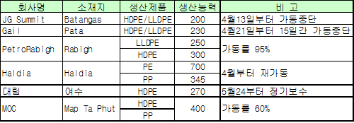 JG· Gail 4월부터 가동중단 … PetroRabigh는 양호 아시아 PE(Polyethylene) 플랜트의 가동중단이 이어지고 있다.JG Summit은 Batangas 소재 HDPE(High-Density PE)/LLDPE(Linear Low-Density PE) 20만톤 플랜트를 각각 4월13일과 4월21일부터 가동중단한다고 밝혔다. 대림산업도 여수 소재 HDPE 27만톤 플랜트를 5월부터 정기보수할 예정이다.