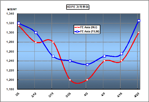 CFR FE Asia 1299-1301달러 형성 … Film 그레이드 수익성 개선 HDPE 가격은 4월21일 CFR FE Asia 톤당 1300달러로 60달러 폭등했다.아시아 HDPE(High-Density Polyethylene) 가격은 원료인 에틸렌(Ethylene) 가격이 상승세를 이어가는 가운데 중국 내수가격 강세에 힘입어 크게 올랐다.