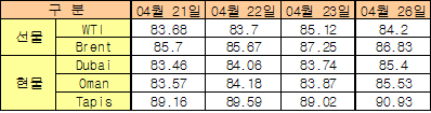 4월23일 1.66달러 올라 85.40달러 형성 … WTIㆍBrent는 하락 반전 4월23일 국제유가는 경기회복 둔화 우려 확산 및 미국의 석유 재고 증가 영향이 지속되면서 하락했다.한국석유공사에 따르면, 뉴욕상업거래소(NYMEX)에서 거래된 WTI(서부텍사스 경질유) 선물유가는 배럴당 84.20달러로 전일대비 0.92달러, Brent 선물유가는 86.83달러로 0.42달러 내렸다. 반면, 두바이유 현물가격은 미국의 경기지표가 일부 개선되고 달러화 약세를 보인 영향이 뒤늦게 반영돼 1.66달러 상승한 85.40달러에 거래를 마감했다.