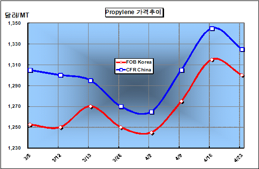 FOB Korea 1299-1301달러 형성 … 4-6월 아시아 정기보수 잇따라 프로필렌 가격은 4월23일 전주대비 15달러 하락해 FOB Korea 톤당 1300달러를 형성했다.아시아 프로필렌(Propylene) 가격은 PP(Polypropylene)가 20달러 상승했음에도 PP의 수익성이 마이너스로 악화돼 수요가 침체되면서 하락세로 반전됐다. 미국에서 프로필렌 재고가 남아돌아 약세를 지속하고 있는 것도 아시아 프로필렌 가격에 영향을 준 것으로 판단된다.
