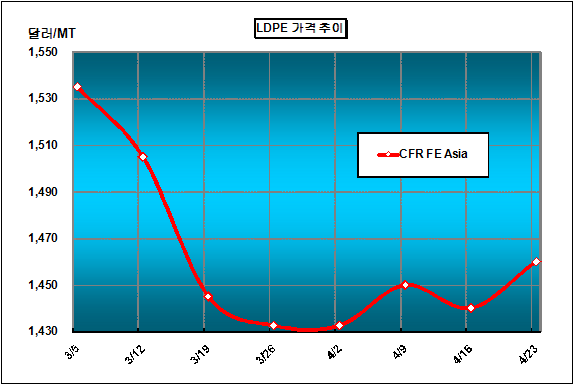 CFR FE Asia 1459-1461달러 형성 … 중국 농업필름 수요 회복 LDPE 가격은 4월21일 CFR FE Asia 톤당 1460달러로 20달러 상승했다.아시아 LDPE(Low-Density Polyethylene) 가격은 아시아 시장의 수급타이트 영향과 중국 및 인디아의 성수기 진입 등의 영향으로 상승세를 지속했다. 특히, 중국에서 농업용 필름 수요가 회복되고 있고, 중동기업들이 재고부족으로 Spot 판매에 나서지 못하고 있어 LDPE 가격상승에 호재로 작용했다.