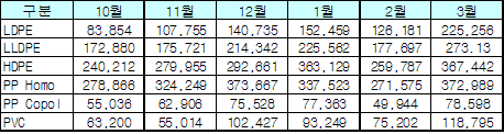 더불어 PP(Polypropylene) Homo 수입도 증가세를 보였다.