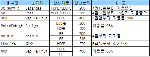 JG Summit은 Batangas 소재 HDPE/LLDPE(Linear Low-Density PE) 20만톤 플랜트를 4월13일부터, Gail은 Pata 소재 23만톤 플랜트를 4월21일부터 15일간 가동중단할 예정이다.