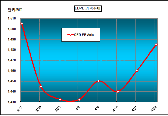 LDPE 가격은 4월28일 CFR FE Asia 톤당 1485달러로 25달러 상승했다.