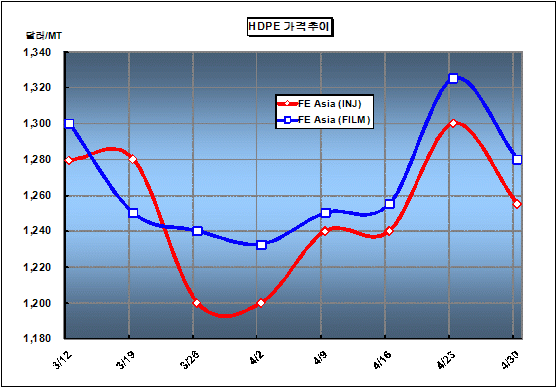 CFR FE Asia 1254-1256달러 형성 … 중국 플래스틱 수요침체 영향 HDPE 가격은 4월28일 CFR FE Asia 톤당 1255달러로 45달러 하락했다.아시아 HDPE(High-Density Polyethylene) 가격은 원료인 에틸렌(Ethylene)이 1300달러를 돌파했음에도 불구하고 재고 압박과 Film 그레이드 수요침체로 1300달러가 붕괴됐다. 여기에 중국의 플래스틱 가공기업들이 수요침체에 따라 가동을 중단해 공급과잉으로 이어진 것도 악재로 작용했다.