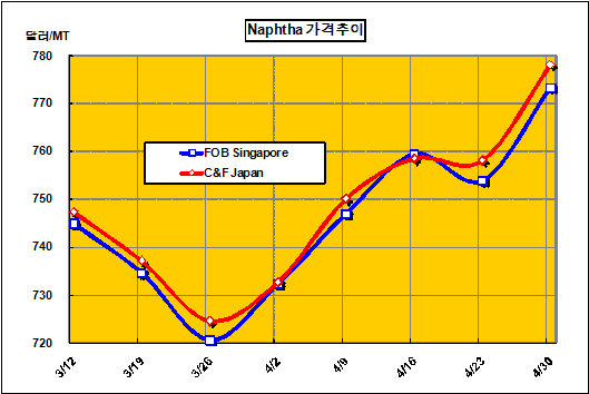 CRF Japan 776-780달러로 20달러 상승 … 유럽도 758달러로 강세 나프타 가격은 4월29일 C&F Japan 톤당 778달러로 20달러 상승했다.아시아 나프타(Naphtha) 가격은 Brent유가 강세를 유지하면서 동반 상승하고 있어 800달러를 돌파할 가능성이 나타나고 있다. 국제유가가 배럴당 83-84달러 수준에서 강세를 지속하고 있기 때문이다.