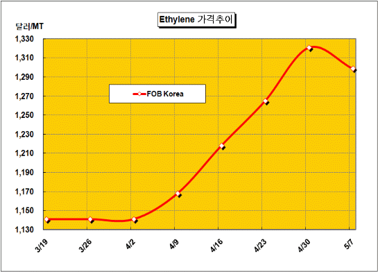 FOB Korea 1298-1300달러 형성 … 원유 과다재고에 달러 강세 영향 에틸렌 가격은 5월7일 FOB Korea 톤당 1321달러로 22달러 하락했다.아시아 에틸렌(Ethylene) 가격은 국제유가가 배럴당 77달러까지 하락하고 높은 원유 재고에 달러화 강세의 영향으로 5주만에 하락세로 전환했다. 여기에 PE(Polyethylene), MEG(Monoethylene Glycol) 등 다운스트림 수요가 침체돼 유도제품 가격이 하락한 것도 악재로 작용했다.