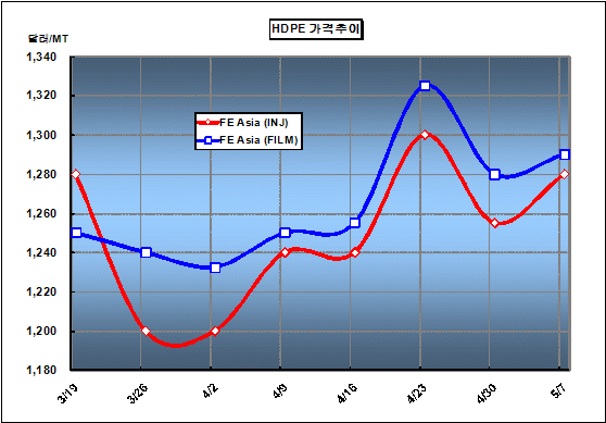 HDPE 가격은 5월5일 CFR FE Asia 톤당 1280달러로 25달러 상승했다.