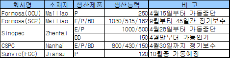 Formosa, 4월 OCU 가동중단 … Sinopec도 부타디엔 15만톤 연기 중국의 올레핀(Olefin) 플랜트 가동이 난항을 겪으면서 공급부족이 불가피해지고 있다.Formosa는 Mailiao 소재 OCU 프로필렌(Propylene) 25만톤 플랜트를 4월15일부터 가동중단하고 있으며, 에틸렌(Ethylene) 103만톤, 프로필렌 51만5000톤, 부타디엔(Butadiene) 16만2000톤 플랜트는 9월부터 45일간 정기보수할 예정이다. Sinopec의 Zhenhai 소재 에틸렌 100만톤, 프로필렌 50만톤 크래커는 4월28일부터 가동중단 중이며, 부타디엔 15만톤 신규 플랜트는 4월말부터 가동될 예정이었으나 연기되고 있다.
