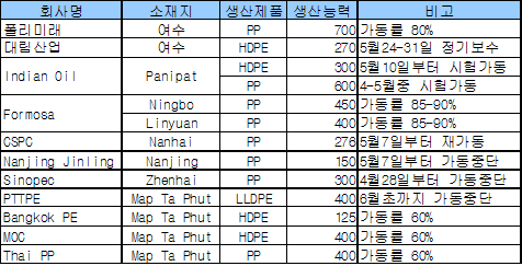 대림, HDPE 5월24일부터 정기보수 … Nanjing Jinling 15만톤 가동중단 아시아 폴리머 플랜트의 가동률이 엇갈린 행보를 보이고 있다.폴리미래는 여수 소재 PP(Polypropylene) 70만톤 플랜트의 가동률을 80% 선으로 유지하고 있고, 대림산업은 여수 소재 HDPE(High-Density Polyethylene) 27만톤 플랜트를 5월24일부터 1주일간 정기보수한다. Indian Oil은 Panipat 소재 HDPE 30만톤 플랜트를 5월10일부터 시험가동에 들어가며, PP 60만톤 플랜트 역시 5월 시험할 예정이다. Formosa는 Ningbo 소재 PP 45만톤 플랜트와 Linyuan 소재 PP 40만톤 플랜트의 가동률을 85-90% 수준으로 유지하고 있다. CSPC는 Nanhai 소재 PP 27만6000톤 플랜트의 정기보수를 통해 생산능력을 3만6000톤 늘리고 5월부터 재가동에 들어갔다.