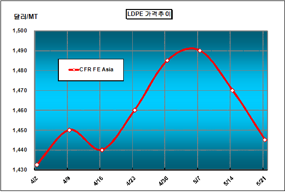 CFR FE Asia 1445달러 형성 … 아시아 수요침체에 중국구매 보류 LDPE 가격은 5월19일 CFR FE Asia 톤당 1445달러로 25달러 하락했다.아시아 LDPE(Low-Density Polyethylene) 가격은 원료인 에틸렌(Ethylene) 가격이 195달러 폭락했고, 유럽발 경제위기에 따른 심리적 위축 영향으로 아시아 수요가 침체되면서 2주 연속 하락했다. 특히, 중국의 최종수요처들은 국제유가가 하락하면 LDPE 구매에 소극적인 편이어서 5월 넷째 주 국제유가가 배럴당 70달러를 형성함에 따라 구매에 나서지 않았기 때문에 가격하락에 영향을 미친 것으로 해석된다.