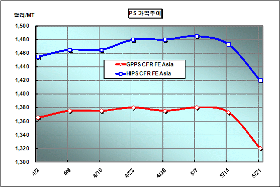 CFR SE Asia 1319-1321달러 형성 … 유럽발 금융위기 영향 우려 PS 가격은 3월10일 CFR SE Asia 톤당 1319달러로 53달러 하락했다.아시아 GPPS(General Purpose Polystyrene) 가격은 원료 SM(Styrene Monomer) 가격이 톤당 1200달러 수준으로 하락한 영향을 받아 급락했다. 더불어 유럽발 금융위기 우려가 확산되면서 수요기업들이 구매를 기피하고 있어 당분간 하락이 지속될 전망이다.