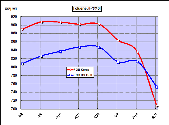 FOB Korea 707-708달러 형성 … 국제유가 급락에 구매수요 감소로 톨루엔(Toluene) 가격 하락세가 계속되고 있다.아시아 톨루엔 가격은 전주대비 128달러 하락해 FOB Korea 톤당 707-708달러를 형성했다. 원유가격이 배럴당 70달러 수준으로 하락하고 아시아 수요가 크게 줄어들었기 때문으로 파악된다. 중국에서는 6월 인도물량이 톤당 730-735달러, 7월에는 12달러 떨어진 718-720달러에 거래되고 있는 것으로 나타났다.