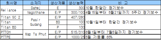 PTTCH, 6월1일부터 시작 … PTTPE는 가동률 65%에 그쳐 동남아시아의 올레핀(Olefins) 정기보수가 봇물을 이루고 있다.PTTCH는 Map Ta Phut 소재 에틸렌(Ethylene) 51만5000톤, 프로필렌(Propylene) 31만톤 플랜트를 6월1일부터 7월5일까지 정기보수할 예정이다. Reliance는 Nagothane 소재 에틸렌 30만톤, 프로필렌 10만톤을 4월15일부터 5월21일까지 정기보수했고, Dahej 소재 에틸렌 30만톤은 10월 한달간 정기보수할 예정이다. Titan도 Pasir Gudong 소재 에틸렌 40만7000톤, 프로필렌 26만톤과 부타디엔(Butadiene) 13만톤을 10월1일부터 한달간 정기보수할 예정이다.