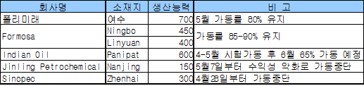 JinlingㆍZhenhai 가동중단 … 폴리미래ㆍFormosa는 80%대 가동 아시아 PP(Polypropylene) 플랜트들의 가동률이 양분화되고 있다.폴리미래의 여수 소재 70만톤 플랜트는 4월 가동률 100%를 나타냈으나 5월에는 80%을 유지하고 있다. Formosa의 Ningbo 소재 45만톤 플랜트와 Linyuan 소재 40만톤 플랜트 역시 각각 85-90%의 가동률에 그치고 있다. Indian Oil은 Panipat 소재 60만톤 플랜트 건설을 완료하고 4-5월 시험가동을 마치고 6월부터 가동률을 65%로 끌어올릴 것으로 알려지고 있다.