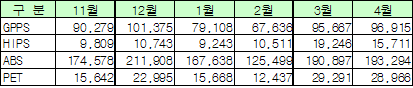 GPPSㆍABS 수입 소폭 증가 … HIPSㆍPET는 소폭 감소 중국의 4월 폴리머(Polymer) 수입이 보합세를 나타냈다.GPPS(General Purpose Polystyrene)는 2009년 11월 9만279톤에서 12월 10만1375톤으로 증가했으나 2010년 1월 7만9108톤, 2월 6만7636톤으로 감소했다. 하지만, 3월 9만5667톤을 기록하며 41.4% 폭증했고, 4월에도 9만6915톤을 나타내며 증가세를 이어갔다. ABS(Acrylonitrile Butadiene Styrene)는 2009년 11월 17만4578톤, 12월 21만1908톤으로 증가세가 이어졌으나 2010년 1월 16만7638톤, 2월 12만5499톤으로 감소세를 나타냈다. 반면, 3월에는 52.1% 늘어난 19만897톤을 기록한 후 4월 역시 19만3294톤을 나타내며 증가세가 지속되고 있다.
