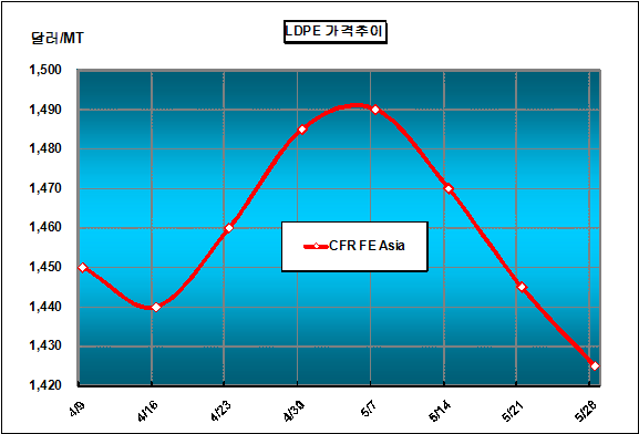 CFR FE Asia 1425달러로 20달러 하락 … 에틸렌 폭락에 수요 위축 LDPE 가격은 5월26일 CFR FE Asia 톤당 1425달러로 20달러 하락했다.아시아 LDPE(Low-Density Polyethylene) 가격은 원료 에틸렌(Ethylene)이 100달러 폭락했고, 유럽발 경제위기로 인한 심리적 위축 영향으로 아시아 수요가 침체되면서 3주 연속 하락했다. 특히, 6월 첫째 주에 국제유가가 배럴당 70달러가 붕괴됨에 따라 중국수요 침체가 가시화돼 가격하락에 영향을 미친 것으로 판단된다.